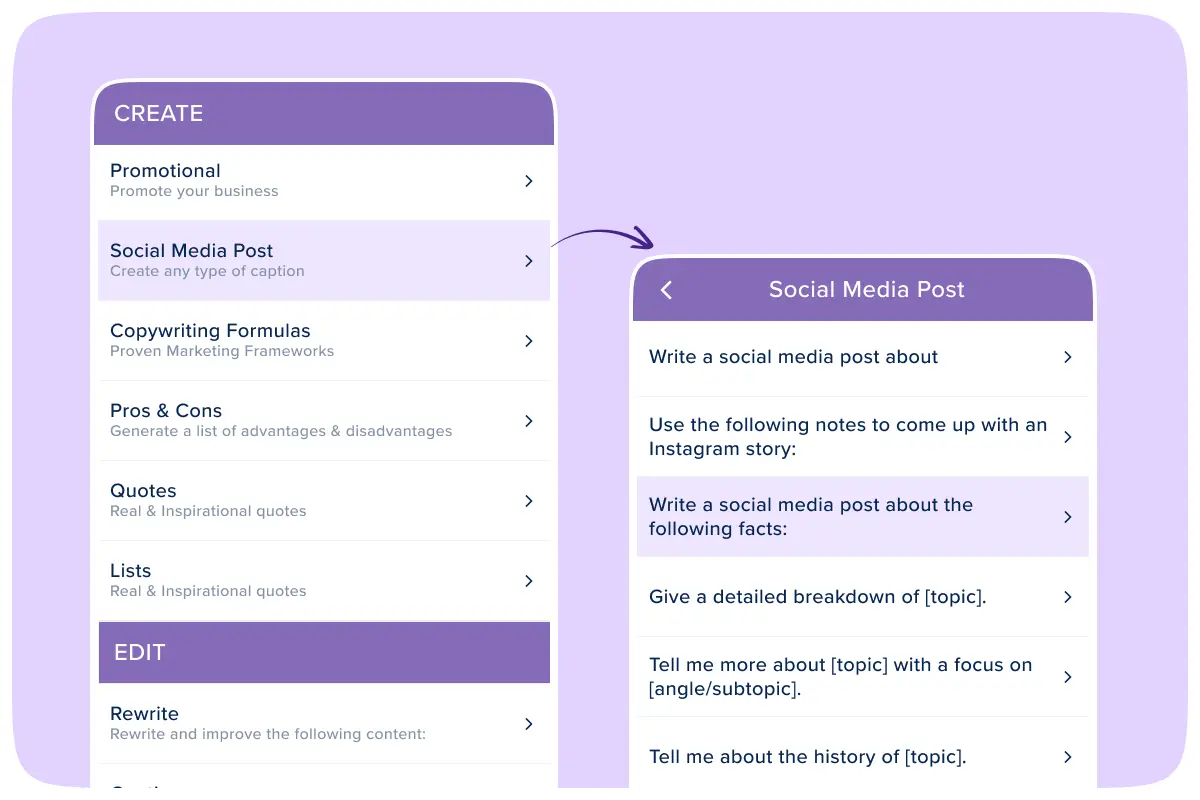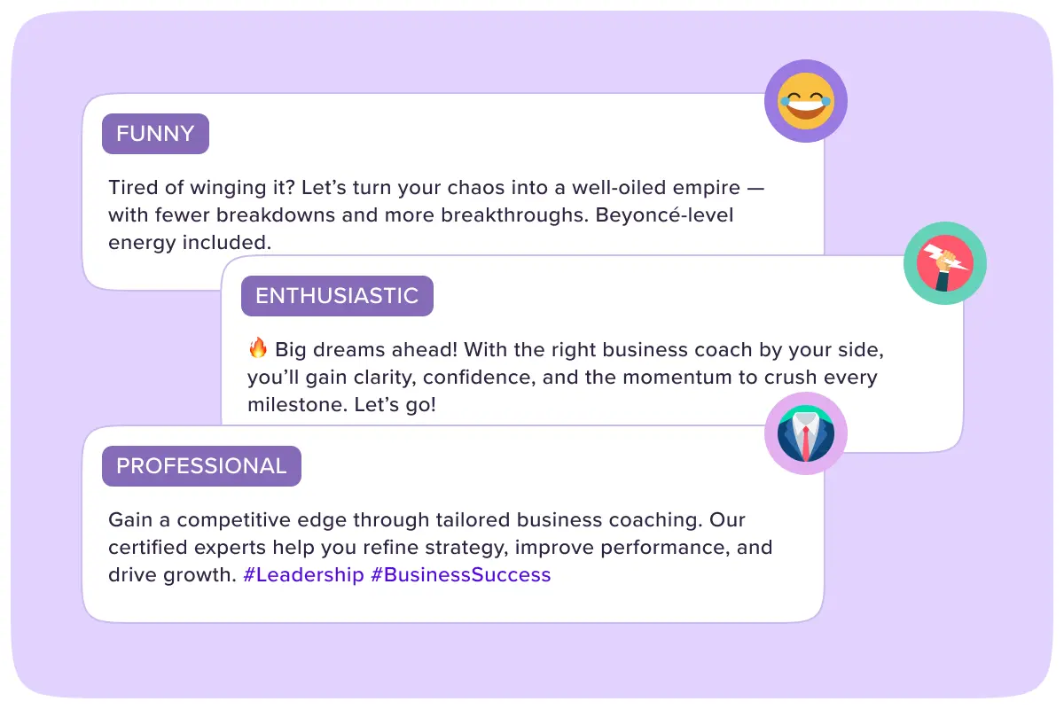 And say hello to infinite content ideas. Let our AI Assistant create unlimited social media captions for you, putting an end to the stress of content creation.